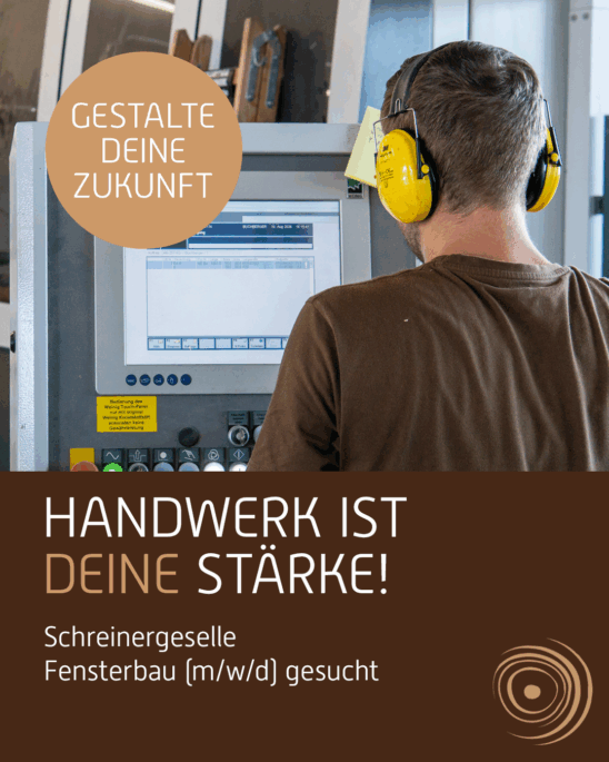 Mit dir als Schreinergeselle möchten wir unser Fensterbau-Team verstärken – mit deinem Können, deiner Zuverlässigkeit und deiner Freude am Arbeiten mit Holz und anderen hochwertigen Materialien.